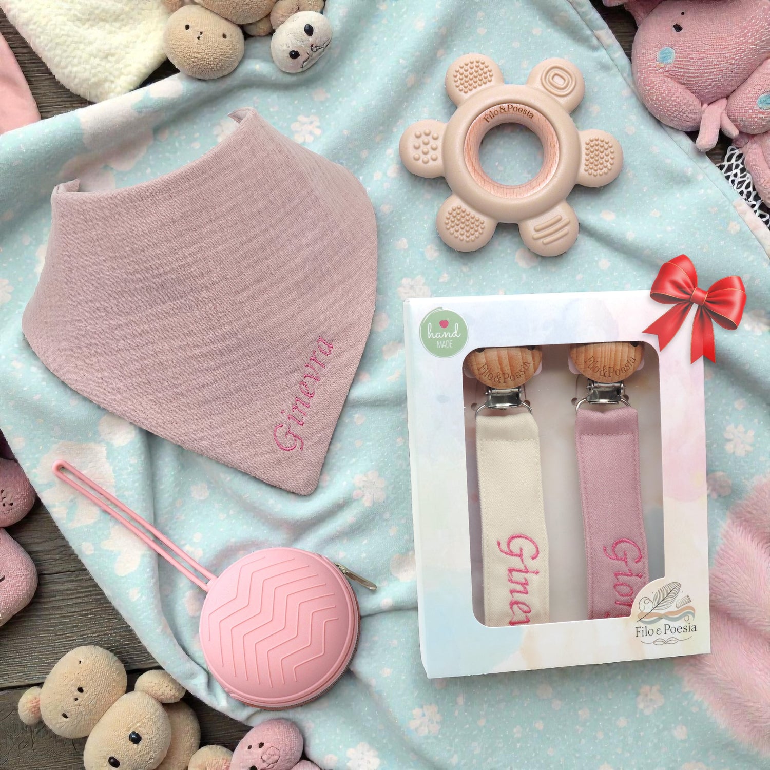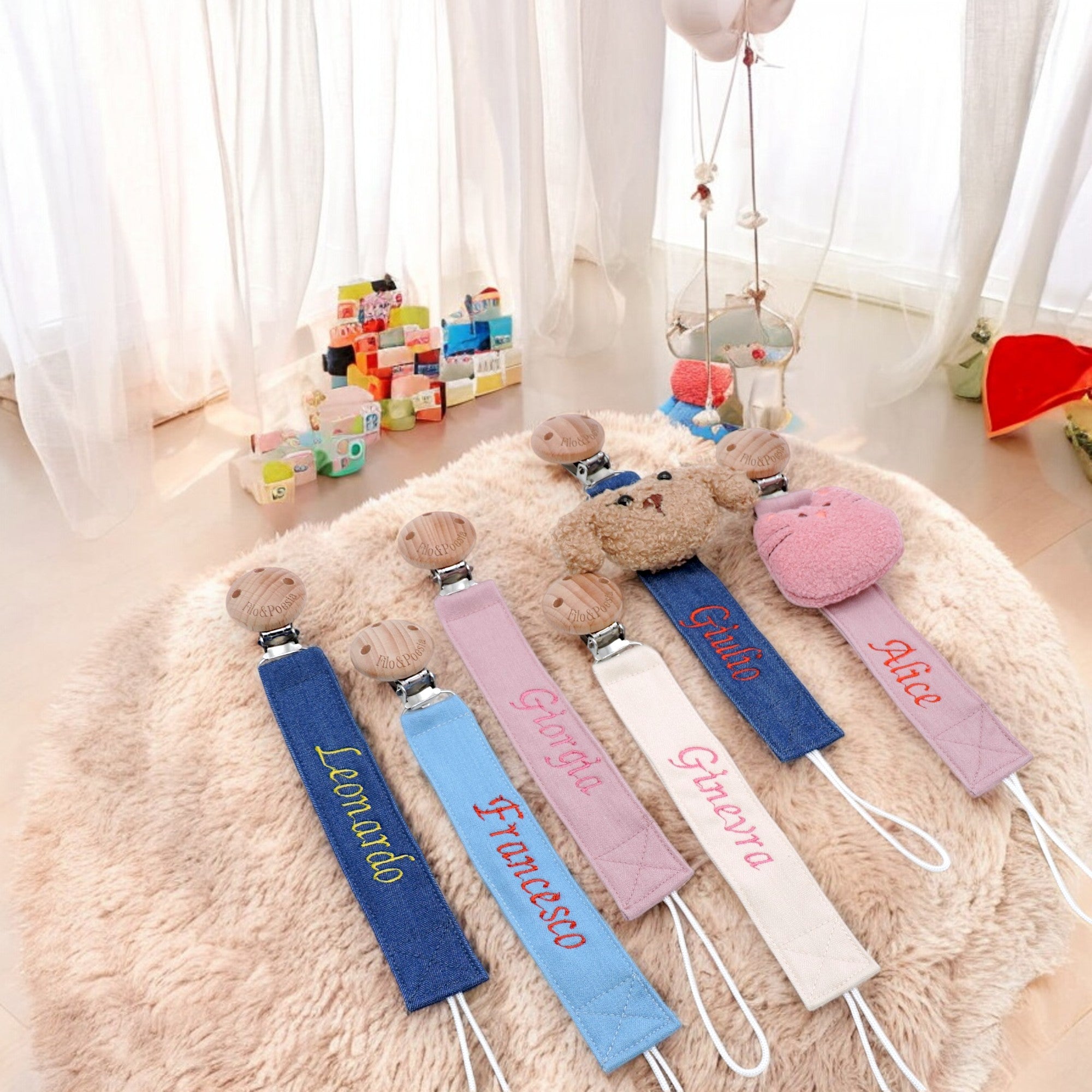 ⭐️⭐️⭐️⭐️⭐️ - Filo&PoesiaSi presentano davvero molto bene, sono due porta ciuccio di due colori differenti. Puoi personalizzarli con il nome che vuoia anche con nomi differenti. Viene cucito a macchina il nome del bambino. Bella idea anche per regali. La spedizione è velocissima