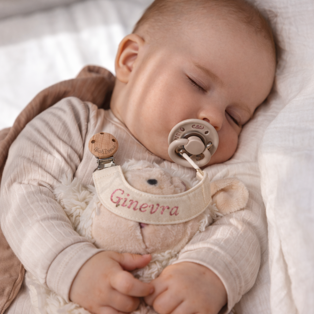 Catenelle portaciuccio personalizzate con nome ricamato, pensate per evitare che il ciuccio si perda o si sporchi.